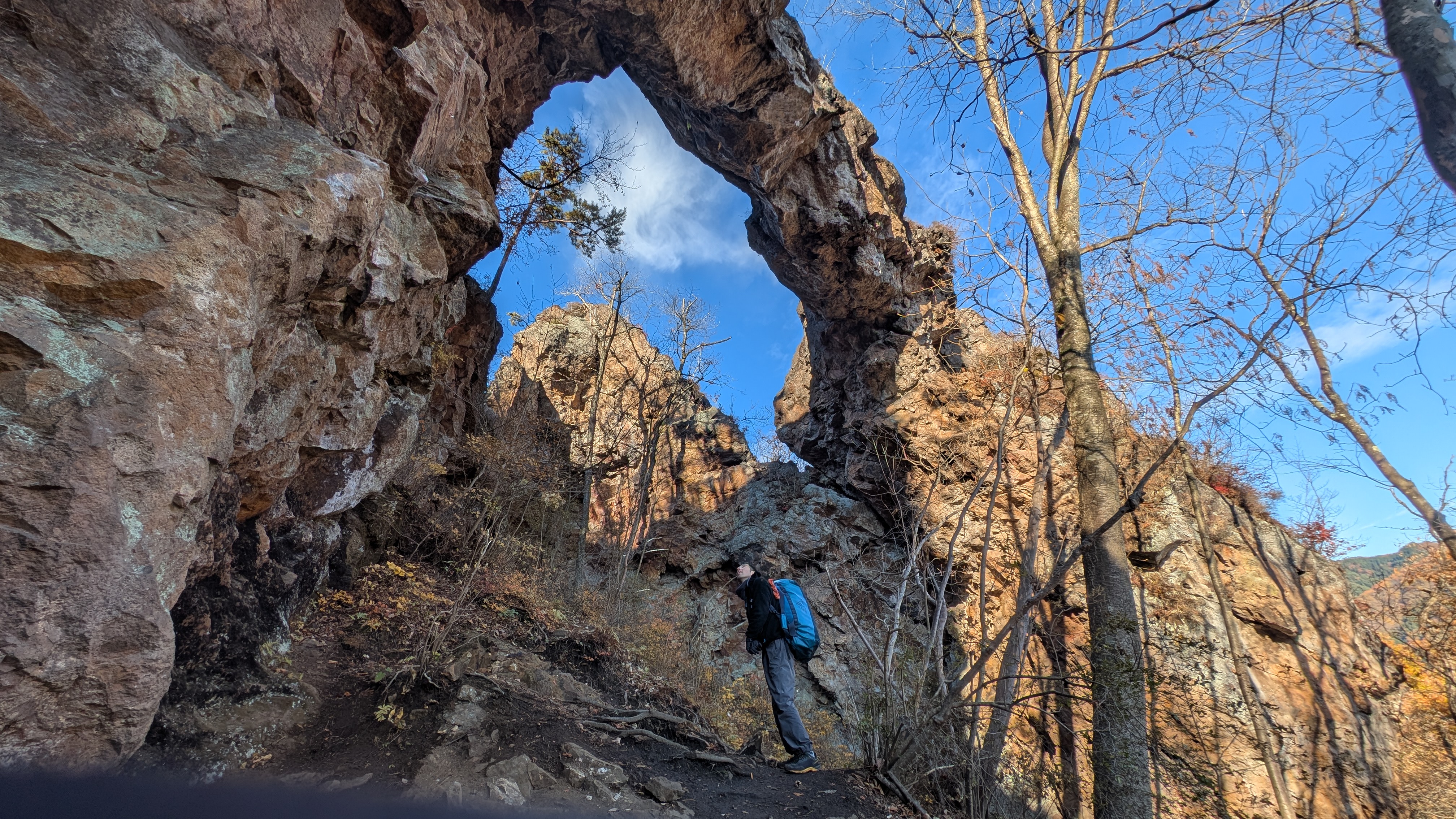 この時期としては、やや暖かい日だったと思うが、天然記念物は右カンテを除き、一日中陽が当たらない。ギリギリ焼き石なしでもいけたが、休憩中は結構寒かった。帰る時、東口の駐車スペースには何台か車があったが、アーチは貸し切りだった。