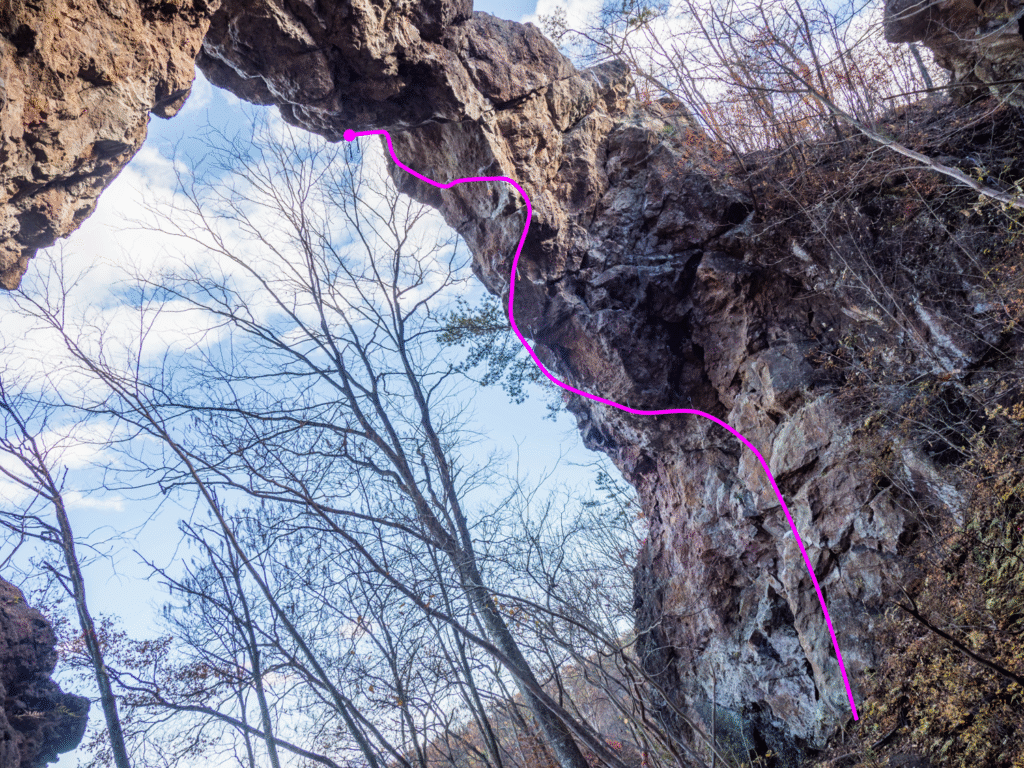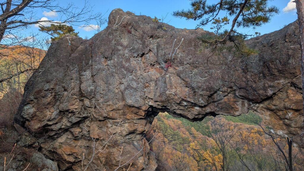 みかけだおし(5.11c)などが引かれている、斜面の上から見てアーチの表側が南西面だろうか。アーチの左側の柱に引かれた、2本の5.10dはよく陽が当たるようだが、右側の柱付近はあまり陽が当たらない。