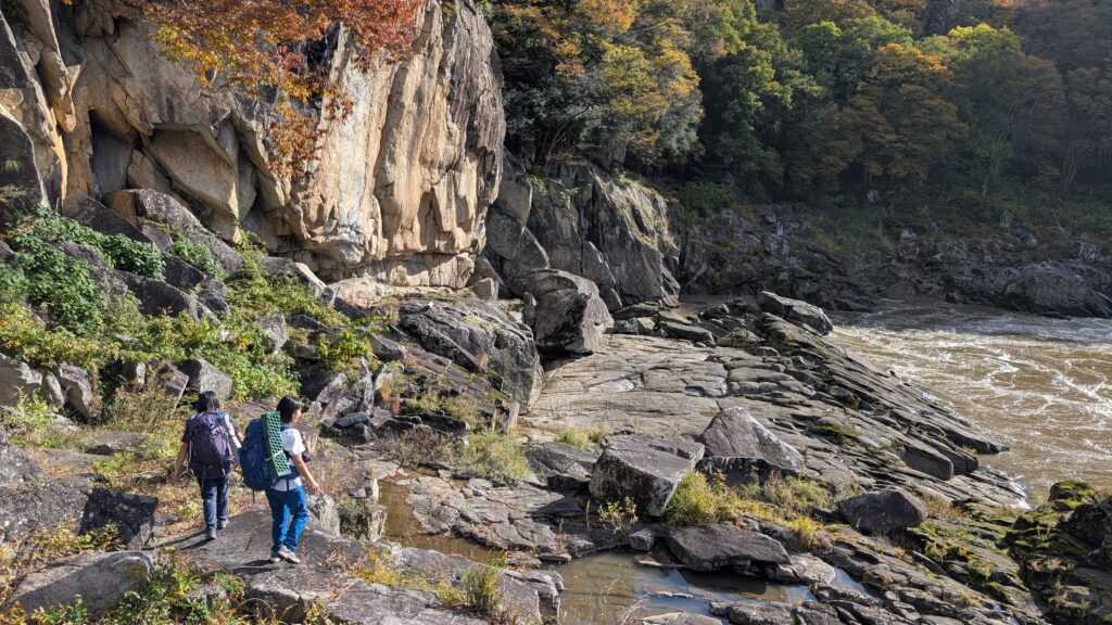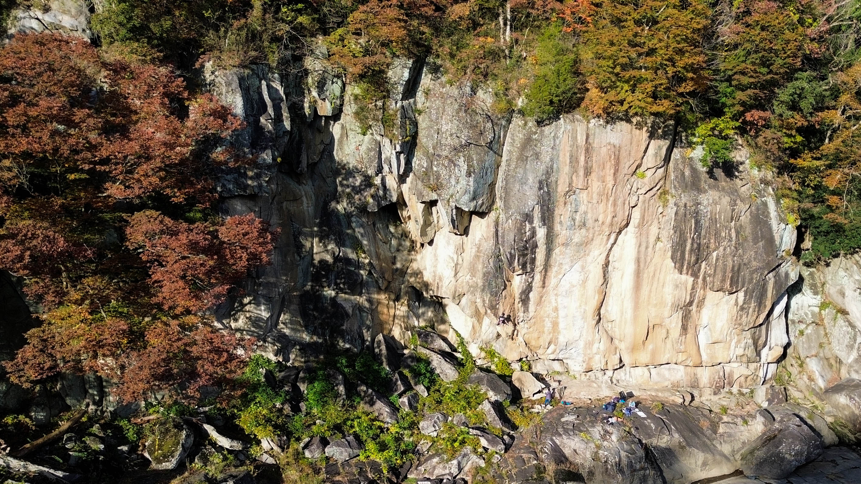 川沿いにある、大きな花崗岩の一枚岩。秩父・長瀞のように、壁の前には岩畳が広がっていて、居心地・ロケーションともに抜群。