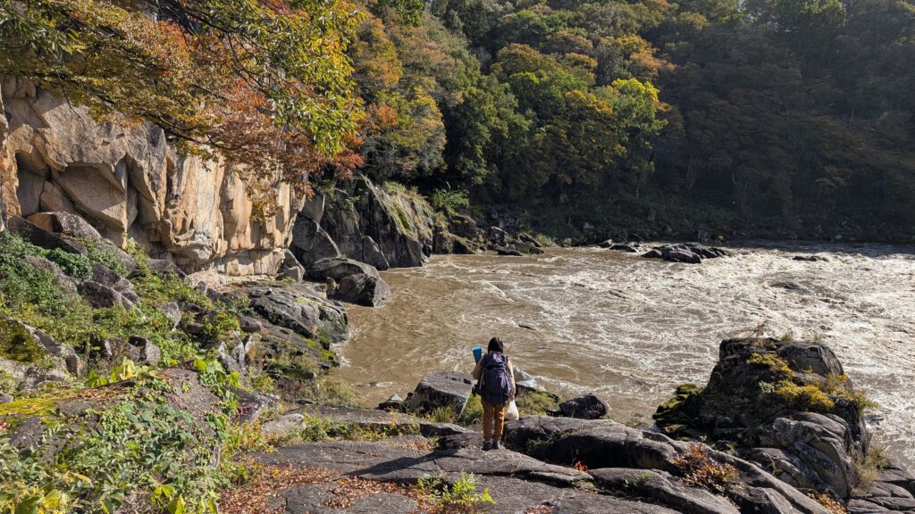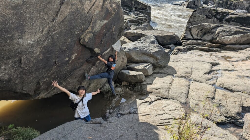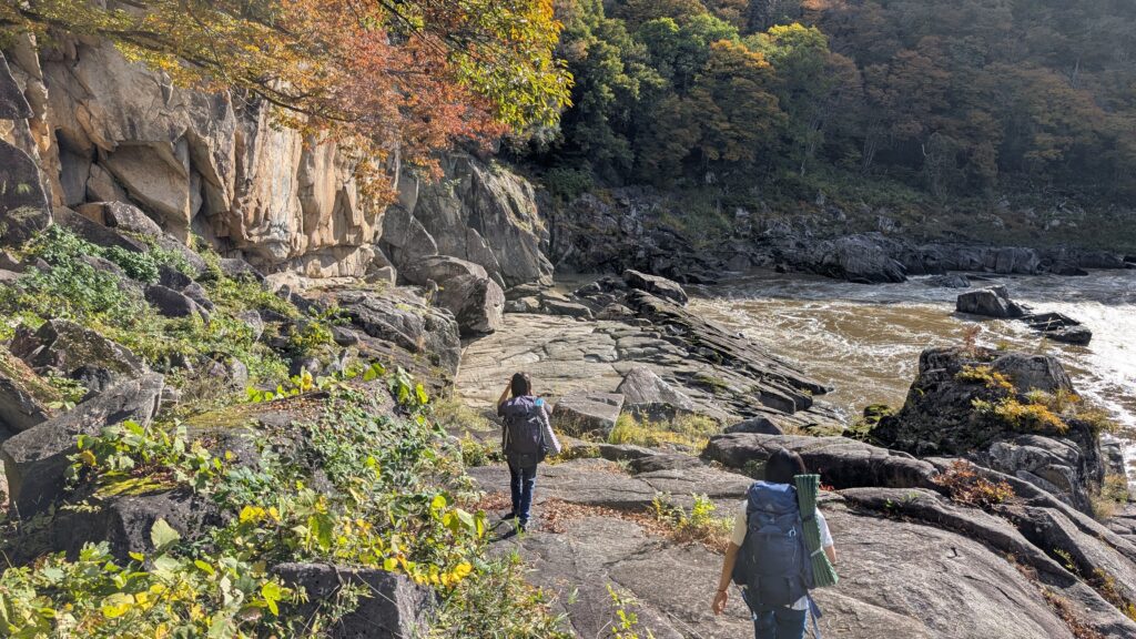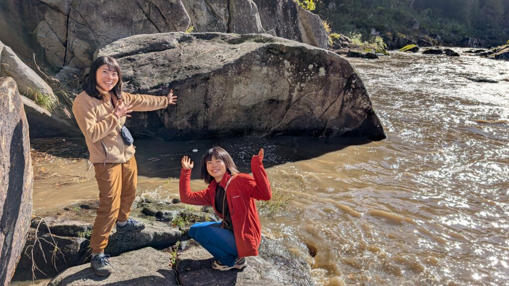 森を抜けて視界が開けると、目の前には濁流の川が広がっていた。僕は初めての大日岩だったが、ハナダテ姉妹はボルダーで以前来たことがあるそうで、今回が2回目。前回は川幅がこの3分の1くらいだったらしく、あまりの違いに驚いている。
