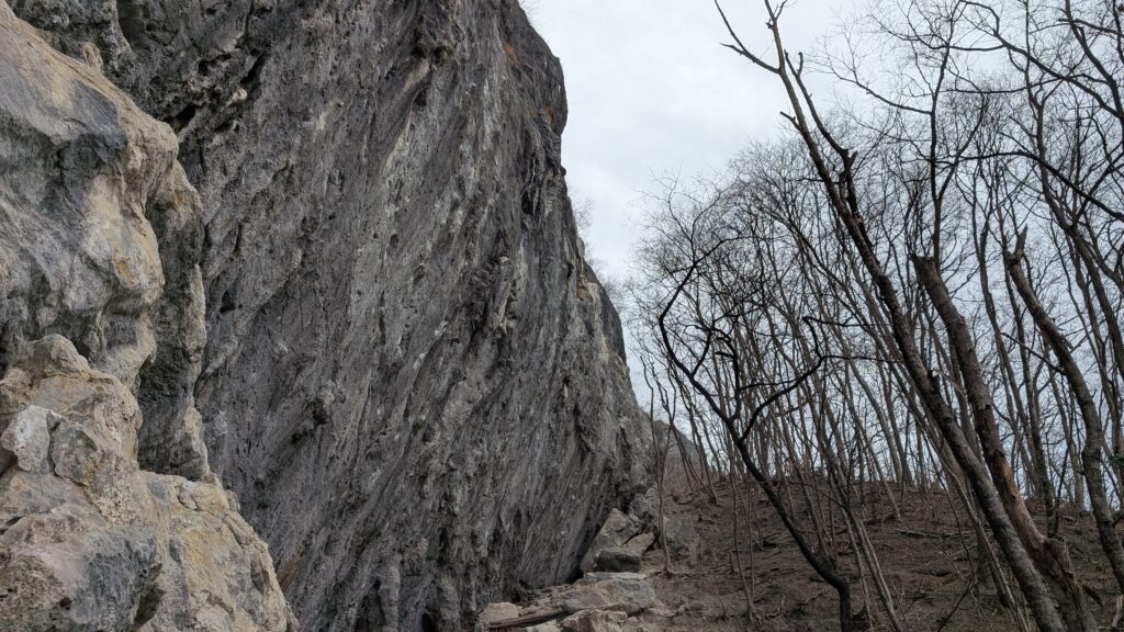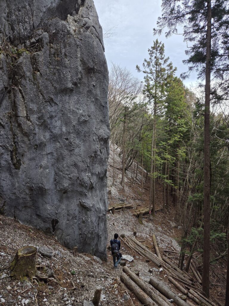 二子山の駐車スペースから、股峠を越え、弓状エリア→広場エリアへ。広場エリアから、さらに岩壁沿いを歩き、途中で一旦下ったまた登る。