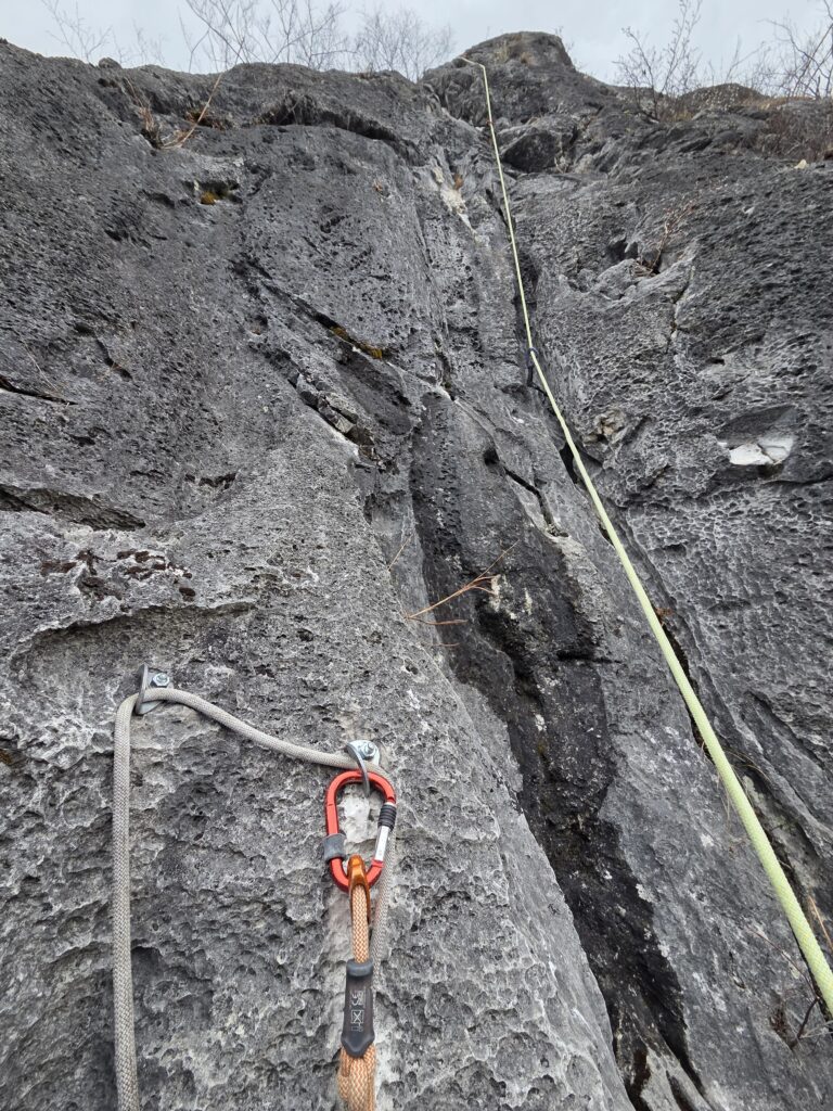 他の人の記録(普段弓状で登っていても、マルチ装備の人は見たことないけど、意外に登られているみたい)を見ると、ダブルロープで登られることが多いようだが、今回はシングルで登ってみた。プロテクションのラインはかなり真っ直ぐだし、全く問題なし。