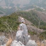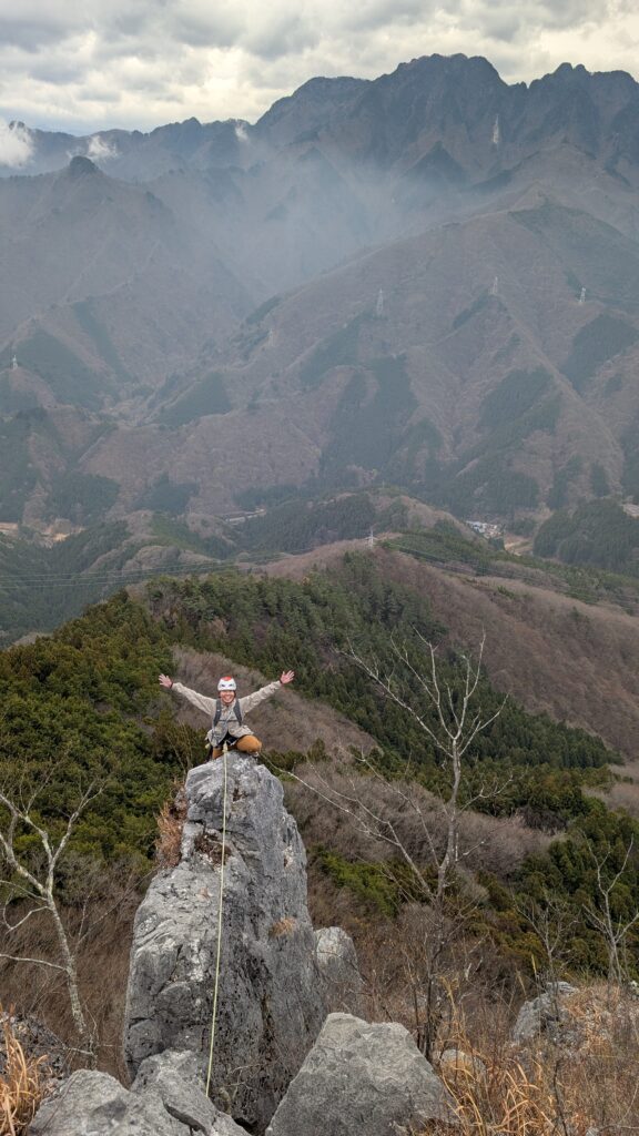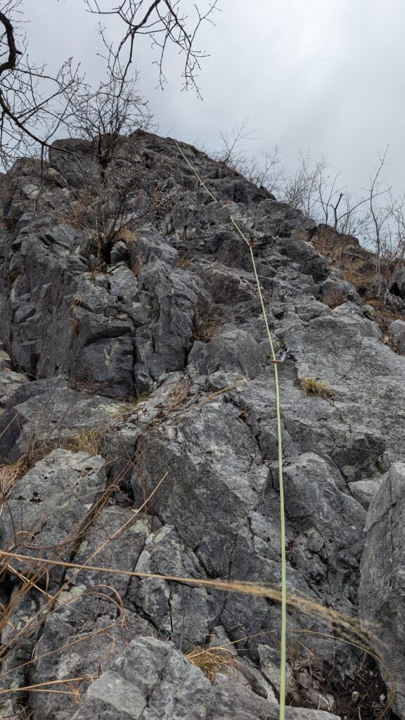 岩峰の頭に立ち、少し歩いて一旦下り(ここが高度感があって一番怖いかも)、そこから左に少し登るとボルト×2の終了点。