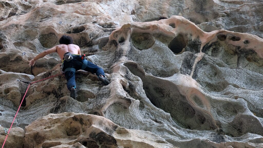 大きな穴がボコボコ開いた強傾斜を登る。スローパー中心のルートかと思いきや、細かいカチやポケットも出てくる。