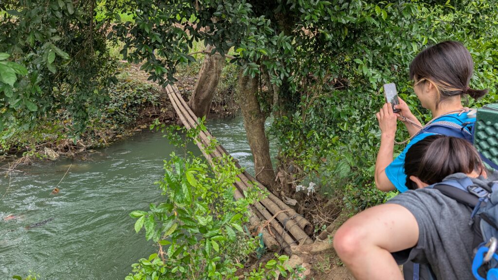 踏み跡を辿って行くと、途中で竹でできたスリリングな橋。これを渡る。