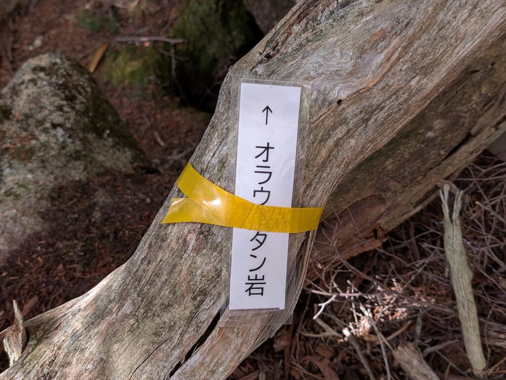 今回は行かなかったけど、疾風のもう少し上、確かマダムチェリー(5.11b)のあたりにオラウータン岩へのアプローチを示す札があった。